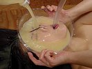 Finally she bathes, soaks her face in a cum pool and washes her hair with bottles of cum.